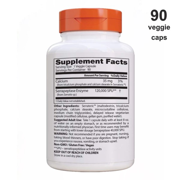 Doctor's Best High Potency Serrapeptase, 120,000 SPU, 90 Veggie Caps ... Doctor's Best High Potency Serrapeptase 120,000 Units 90 Vegetarian Capsules Supplement Facts Serving Size: 1 Vegetarian Capsule Servings Per Container: 90 Amount Per Serving %DV Calcium (from tricalcium phosphate and calcium stearate in Serrateric) 35mg 3% Serrapeptase Enzyme (from Serratio sp.) 120,000 SPU † †Daily Value Not Established. ...