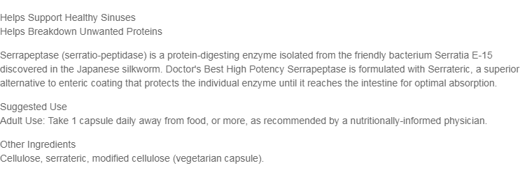 Doctor's Best, High Potency Serrapeptase, 120,000 SPU, 90 Veggie Caps Doctor's Best High Potency Serrapeptase 120,000 SPU is formulated with Serrateric™, a superior alternative to enteric coating that protects the individual enzyme until it reaches the intestine for optimal absorption. Helps support healthy sinuses Helps breakdown unwanted proteins Suggested use